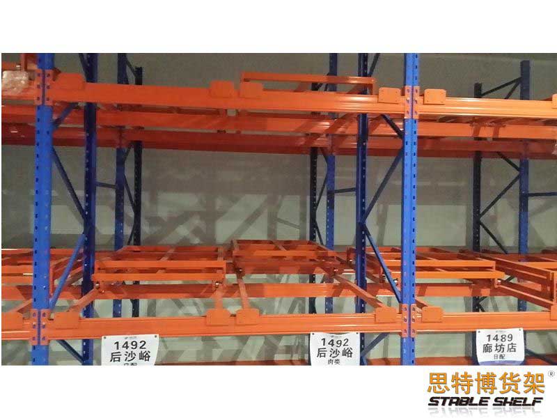 Push-in shelves, also known as push-back shelves, are overlapped between the front and back beams with multi-layer carts, and the stacked goods are placed in the carts from the outside, and the stored goods will push the original goods inside. The push-in shelf is composed of typical structural parts such as a pallet car. The pallet car has flowable characteristics, and the goods are specified to enter and exit at one end of the shelf, and follow the first-in-last-out order. When storing and transporting goods, the forklift only works at the lower end of the shelf aisle and does not need to enter the shelf goods storage aisle. Such shelves have the typical characteristics of high storage density and fast storage and transportation speed. It is usually used in situations where the storage space is extremely limited, but the storage capacity needs to be increased or the goods have time requirements, and the requirements for cargo selection are not high. The advantage of the pressed type is to save the number of operation channels, the forklift is not high, can effectively improve the utilization rate, mainly used in the warehouse space is insufficient, and the area of the warehouse is not large; And the goods must fit the position that can be first in, last out.