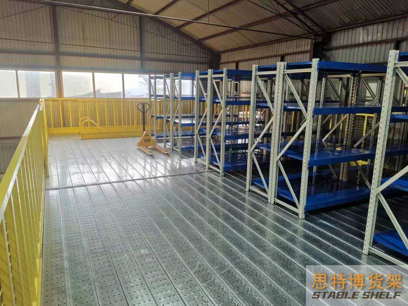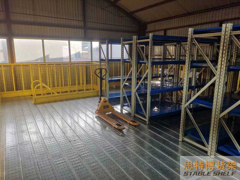 閣樓貨架樓面鋪設(shè)貨架專用樓板,與花紋鋼板或剛格柵相比層載能力強(qiáng)、整體性好、層載均勻、表面平整、易鎖定等特點(diǎn)