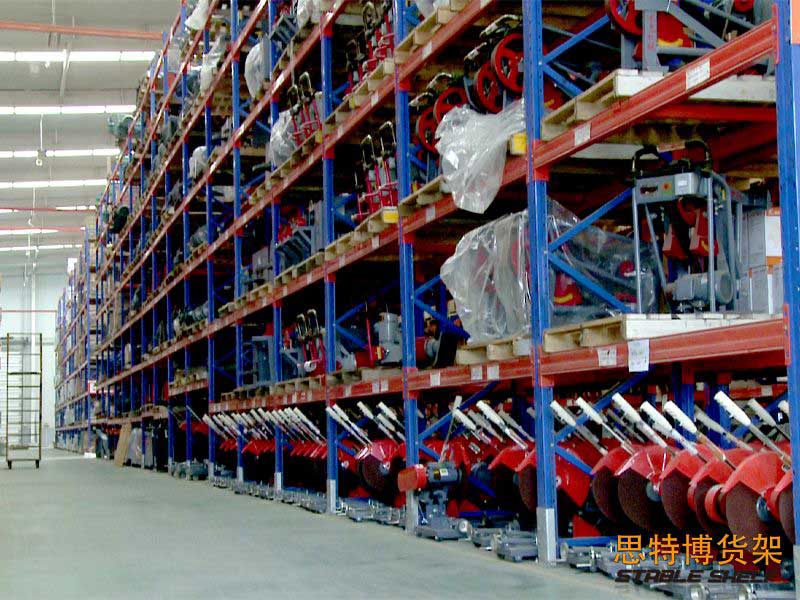 重型貨架是最常用的一種貨架,它具有良好的提取效率。固定架的儲(chǔ)存密度低,儲(chǔ)存的物品較重,必須配合托盤(pán)和叉車使用,所以又稱托盤(pán)貨架。在使用重型貨架時(shí),必須考慮托盤(pán)和貨物的尺寸、重量和堆疊層數(shù),以確定合適的支柱和橫梁尺寸。此外,為提高空間利用率,可減小通道寬度,采用專用堆垛機(jī)的軌道形式,即窄車道式貨架,將存儲(chǔ)空間垂直放置。